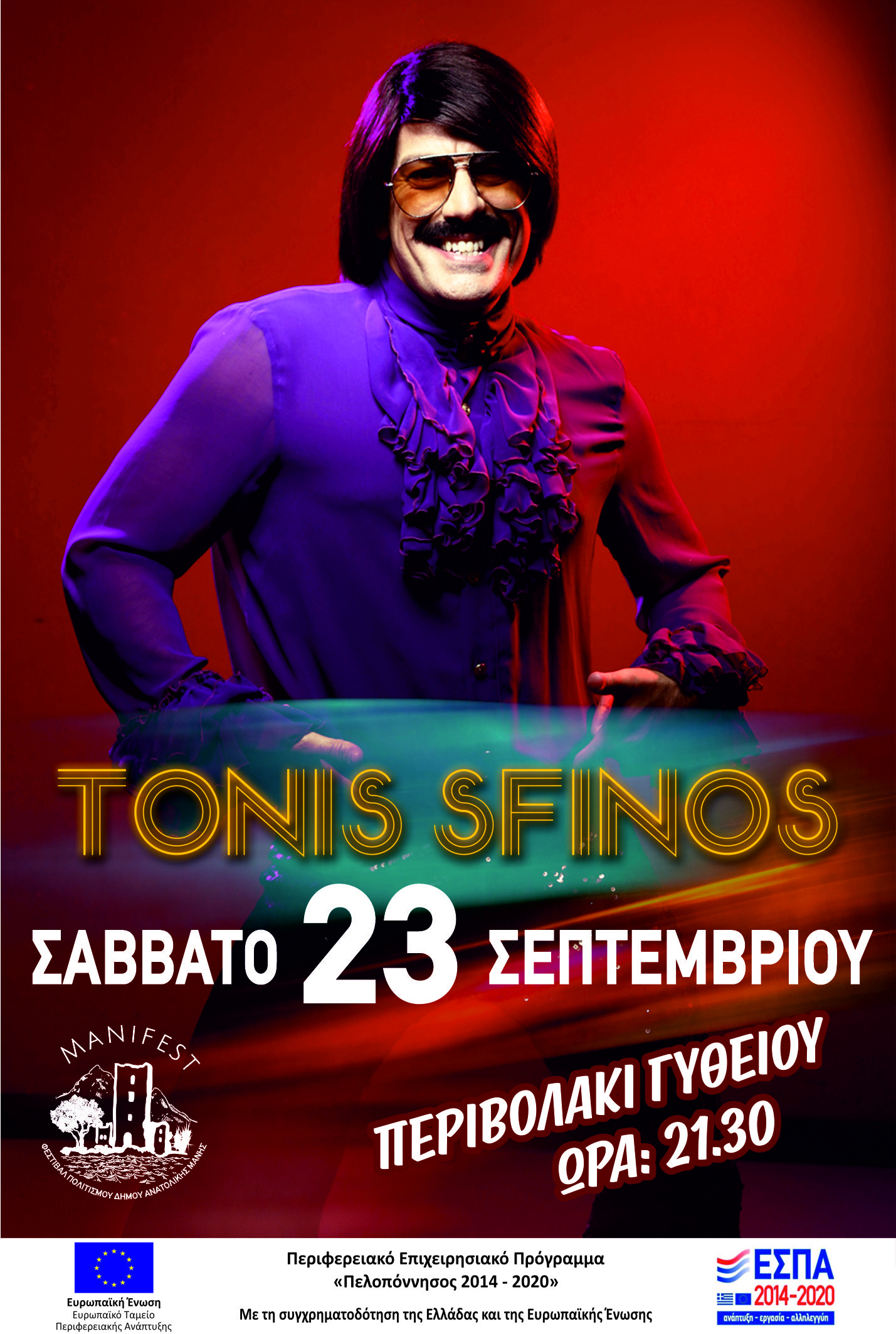 Ο Τόνι Σφήνος, γνωστός performer και παρουσιαστής, με πορεία 13 χρόνων στη διασκέδαση, έρχεται με την μπάντα του το Σάββατο 23 Σεπτεμβρίου στο περιβολάκι Γυθείου, προκειμένου να μας χαρίσει ένα μοναδικό πρόγραμμα με παλιές αγαπημένες αλλά και σύγχρονες επιτυχίες. Μια μεγάλη μουσική αναδρομή στα 60’s, 70’s, 80’s μέχρι το σήμερα, διασκευασμένα με το μοναδικό ύφος του εκρηκτικού καλλιτέχνη.